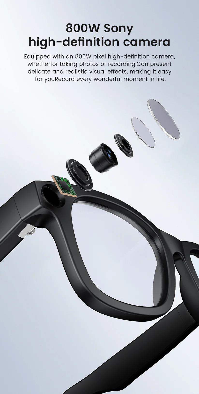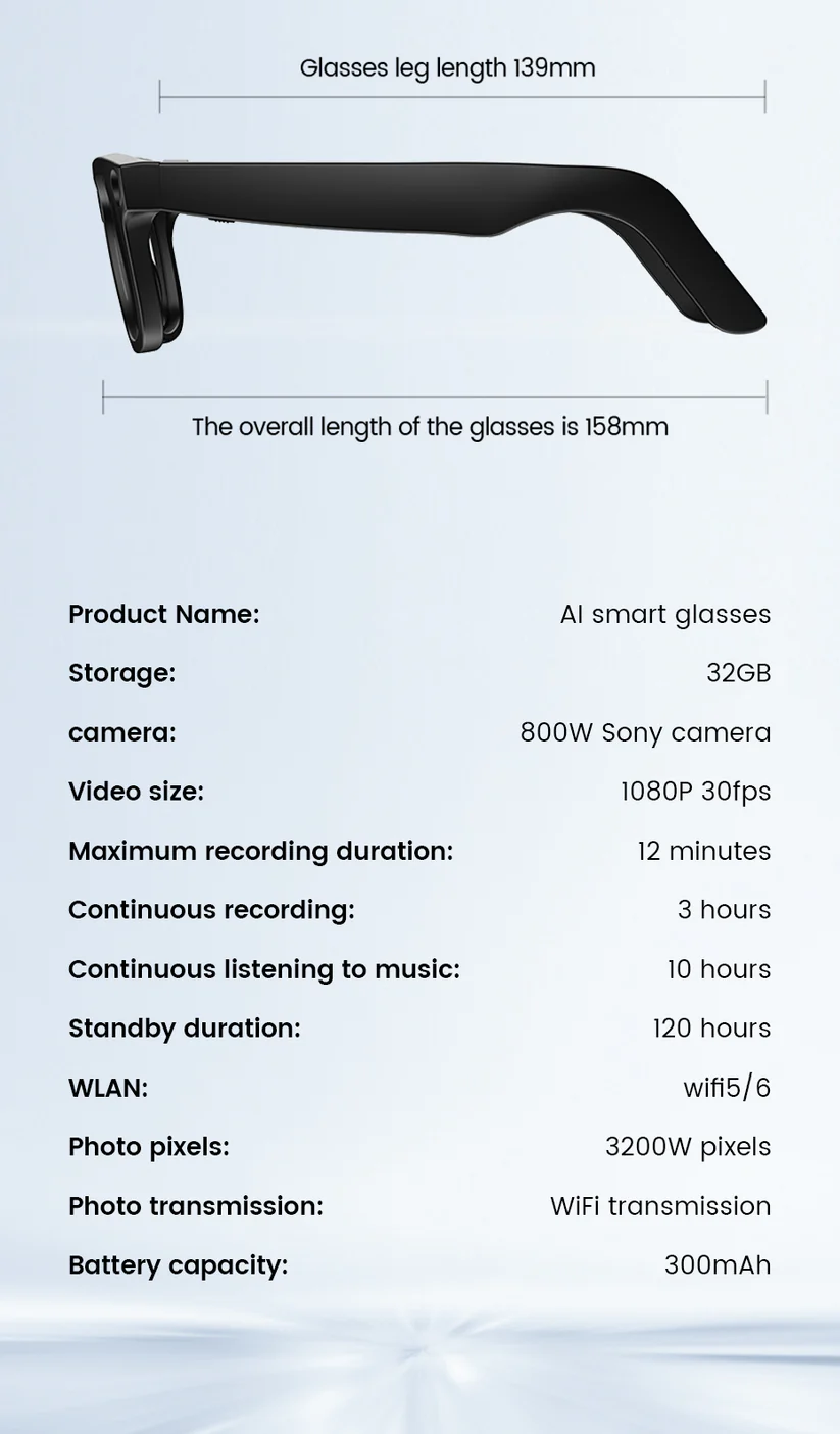 These smart glasses look just like premium fashion eyewear, but inside they are packed with powerful technology. With a built-in 8MP Sony camera, AI recognition, music playback, and hands-free calling, you can stay connected without even touching your phone.
